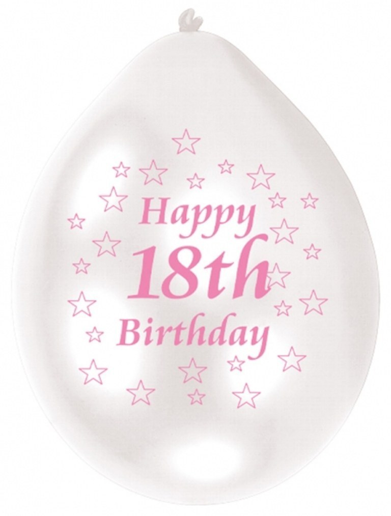 10 Pack of Happy 18th Birthday Balloon. Pack includes 5 white and 5 pink. Balloons measure 9"/22.8cm.