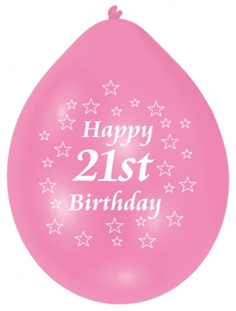 10 Pack of Happy 21st Birthday Balloon. Pack includes 5 white and 5 pink. Balloons measure 9"/22.8cm.