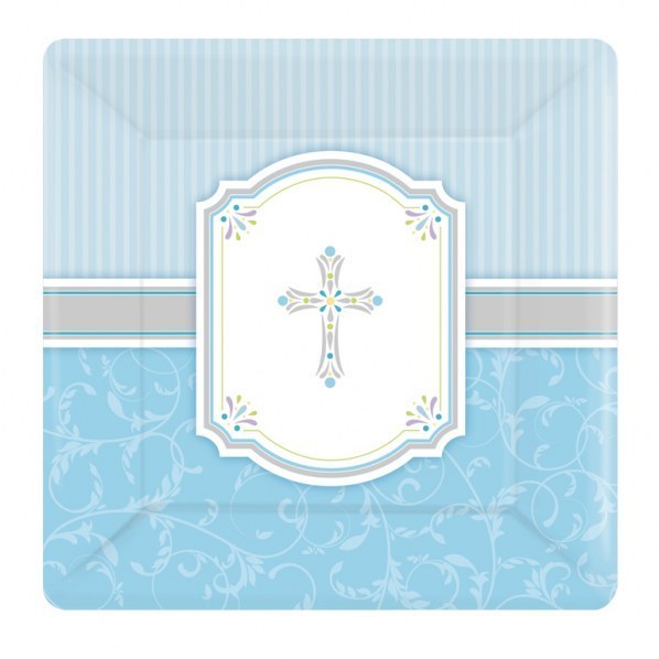 Pack of 8, Blue Communion Blessing Paper Plates, 10" square.