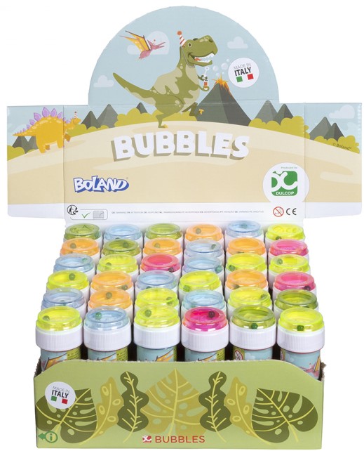 Dino Party Bubbles are mixes assorted colours, 60ml Tub of bubble mixture. All tubs have a maze or puzzle on the top. The wand is attached to the lid.
