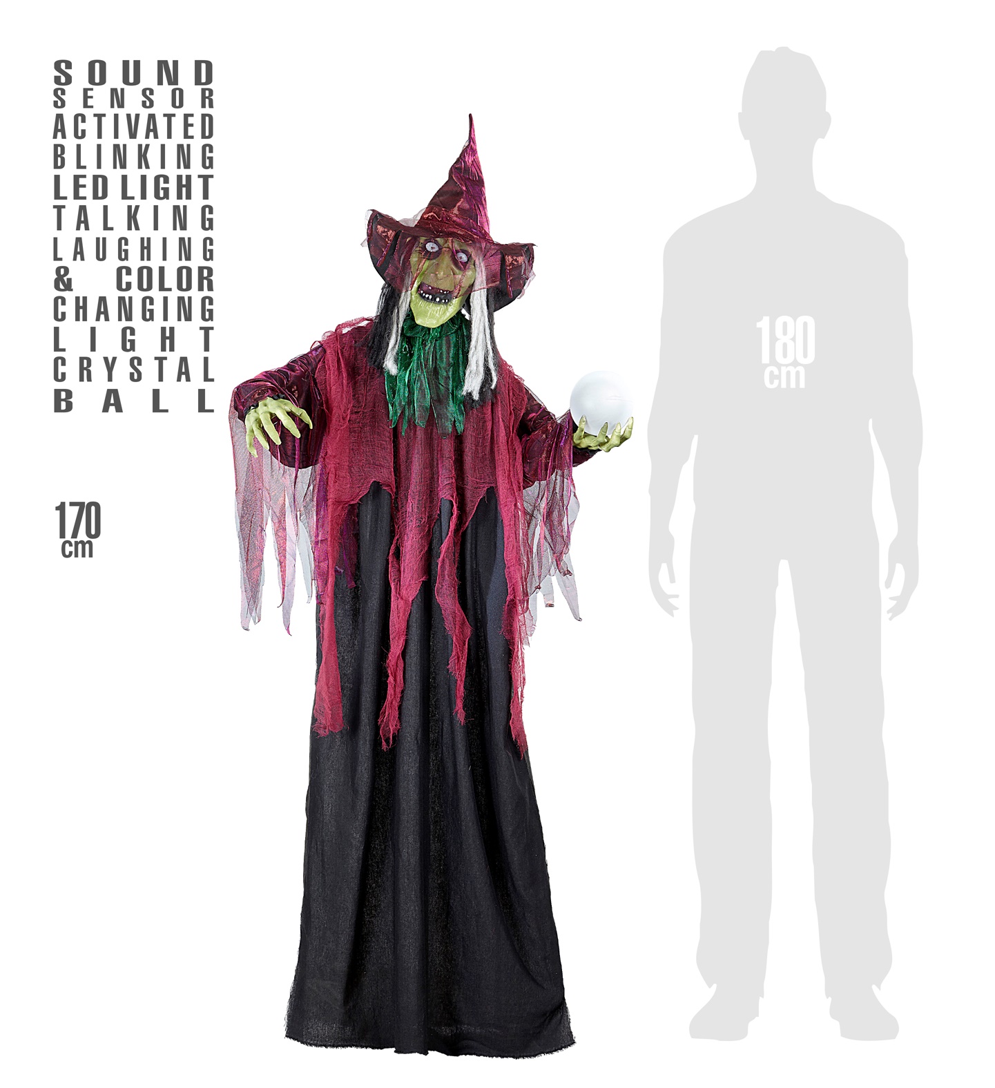 The light and sound witch decoration measures 170 cm. The witch also holds an LED ball, which changes colour. The witch herself speak 3 programmed rhymes.