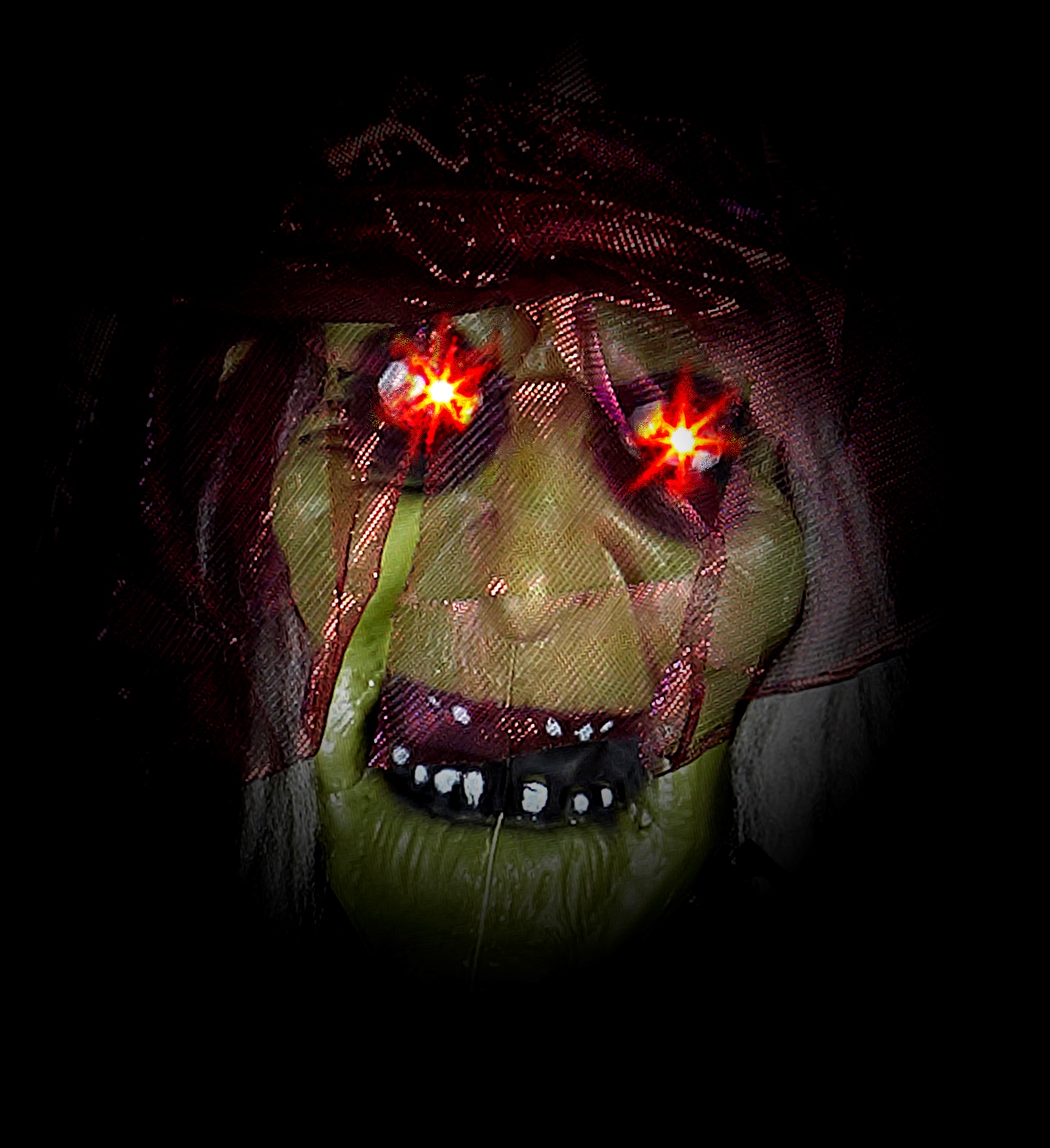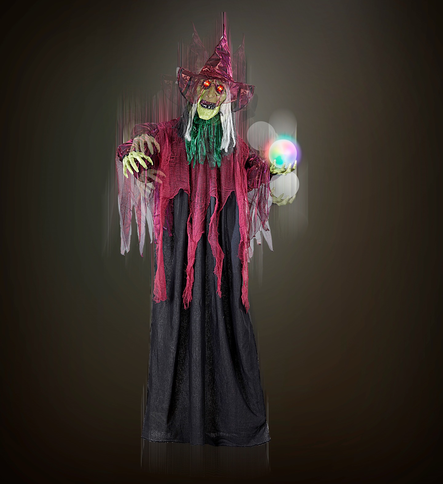 The witch is dressed in a worn-out creepy black blanket. It has a scary face with eyes that light up in red when activated by a sound and it makes creepy noises.