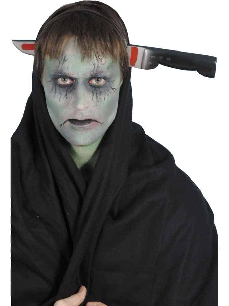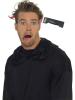 Plastic headband with knife feature at each end. The ideal Halloween prank or costume accessory.