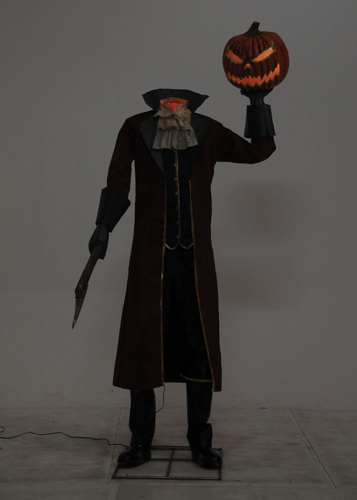 Bring the legend of Sleepy Hollow to life with the Headless Horseman Animated Figure! Standing at a towering 2.15 meters, this mains-operated figure features a turning torso and a moving arm, enhancing its eerie presence. The smouldering pumpkin head lights up while the severed neck adds a chilling touch, creating a truly nightmarish effect. Equipped with a control box, this figure offers multiple settings, including adjustable volume, infrared sensor for motion activation, and step-pad compatibility (step-pad not included). Perfect for Halloween displays, haunted houses, or spooky yard setups, the Headless Horseman guarantees to leave a lasting frightful impression!