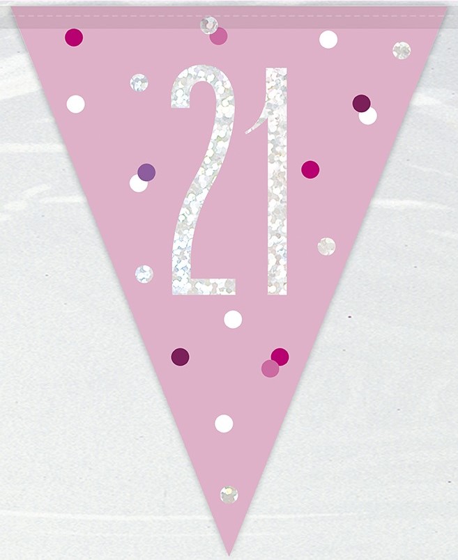 Create a glitzy look for a 21st birthday party with this Birthday Glitz Pink flag bunting. Featuring confetti print pattern and silver holographic number '21' embellishment with prismatic finish, this foil bunting has something special about it.