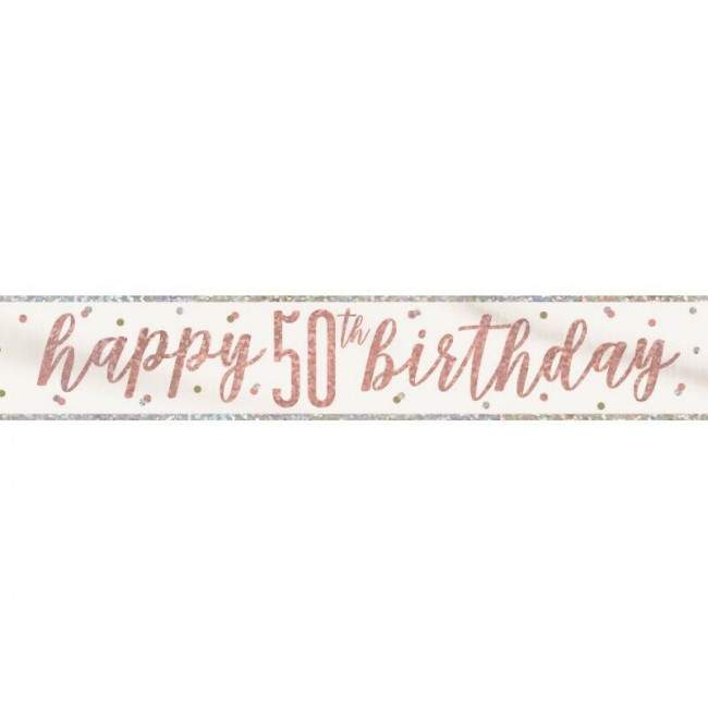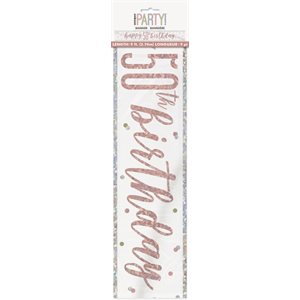 Celebrate your special birthday in style with this eye-catching prismatic Rose Gold 50th Banner. Our banner features a white and silver birthday banner with a holographic effect. The words Happy 50th Birthday are repeated along the length of the banner and the banner is accented with polka dots. Quantity Per Pack: - 1 Rose Gold 50th Banner. Size: - 2.74m (9 Foot)