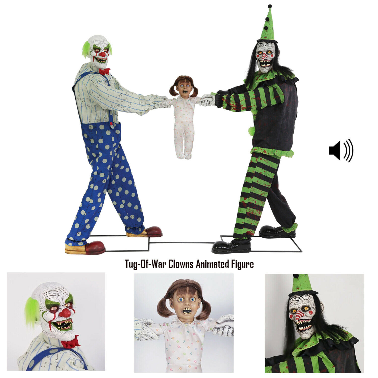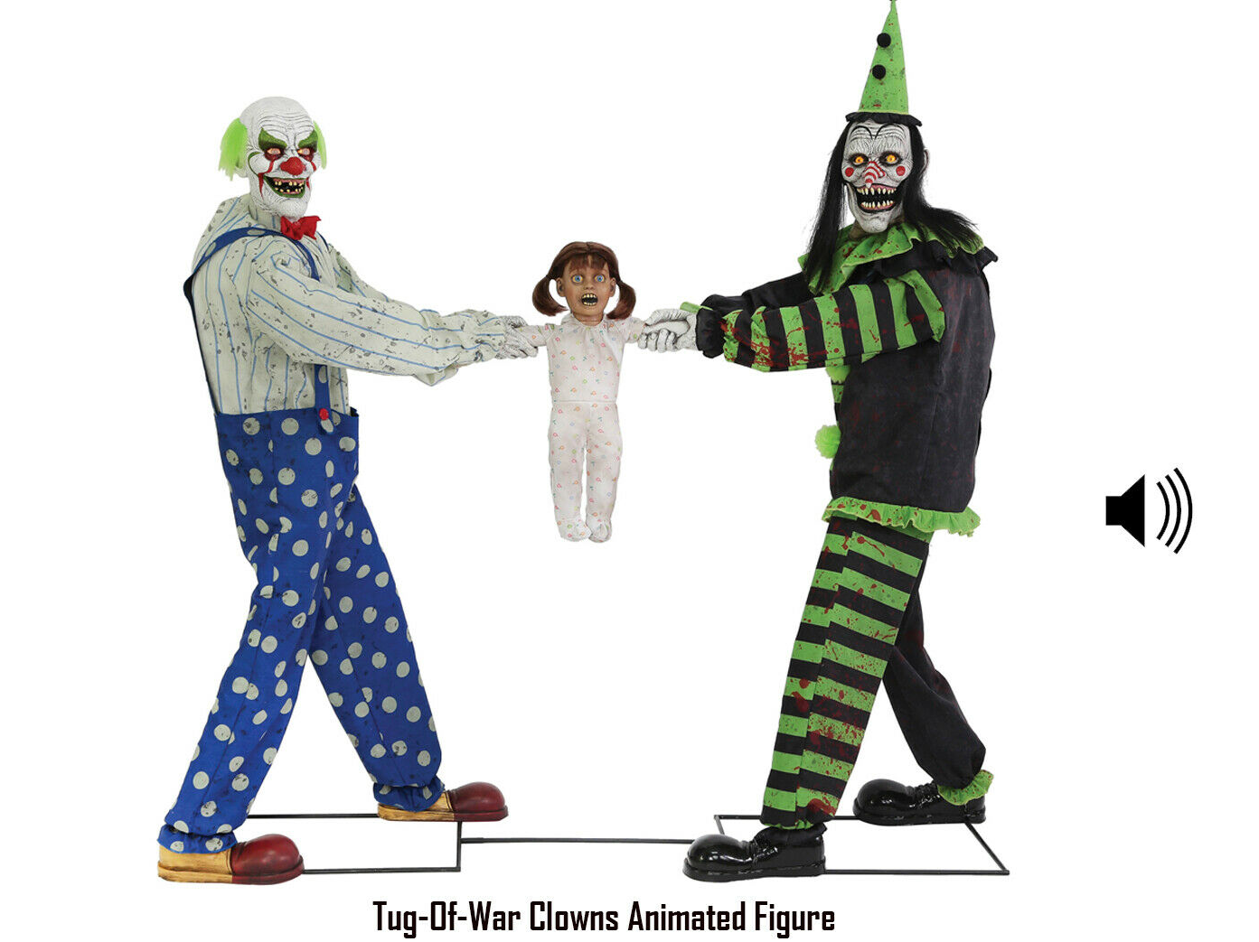 1.8m tall mains operated animated clowns play tug of war with a little girl; pulling her back and forth.