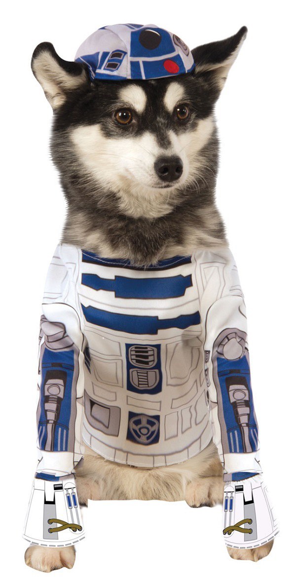 The costume features a printed bodysuit that perfectly captures the look of R2-D2, complete with attached paw covers for an adorable touch.