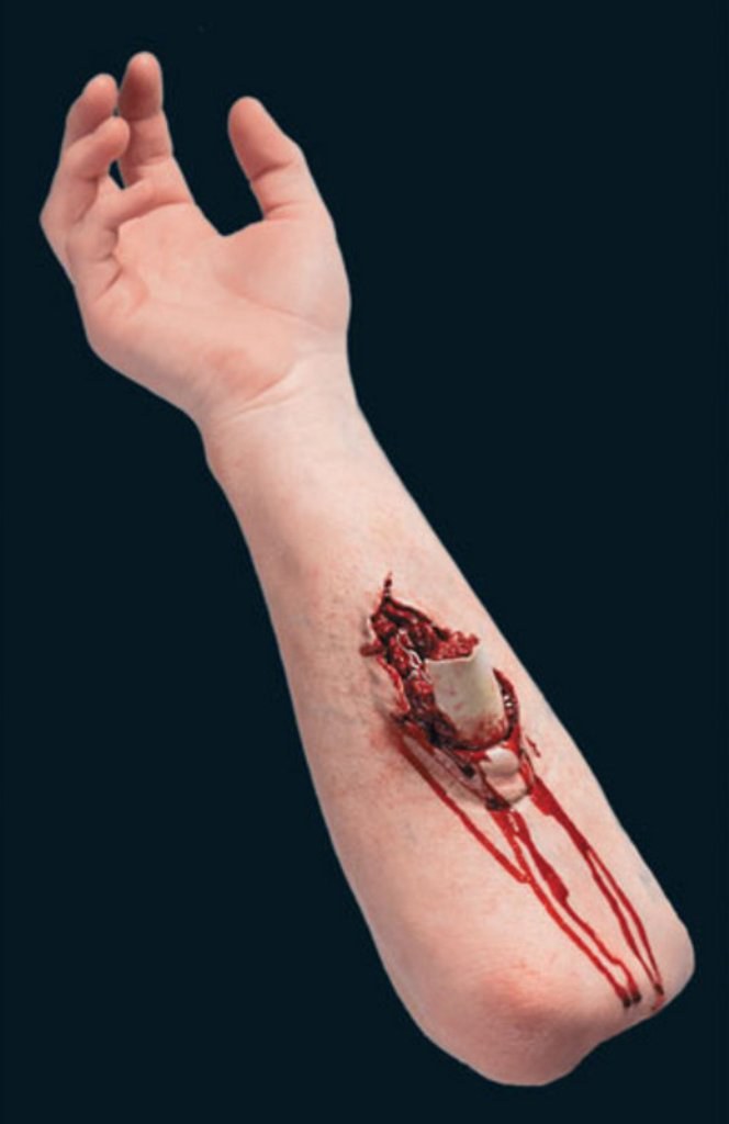 Another Staff Favourite. Busted Bone is realistic and gory. The latex prosthetic includes a large scar and a protruding bone. Scar measures approx 11cm in length.