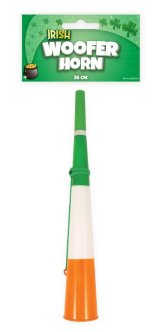 Make some noise and celebrate in style with this fun Irish Woofer Horn. Featuring a bold green, white, and orange design inspired by the Irish flag, this horn is perfect for creating a lively atmosphere at any event.