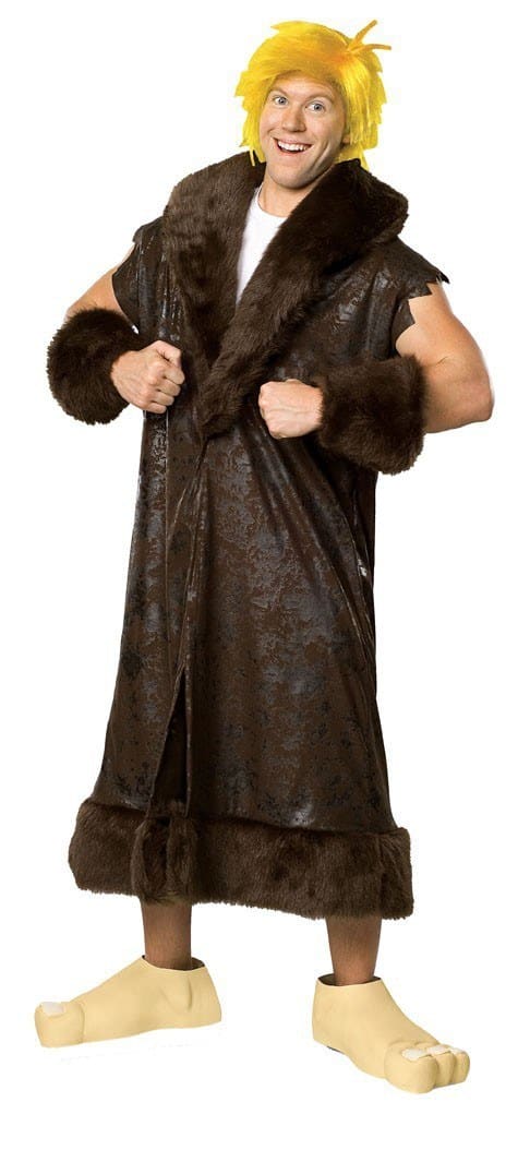 Barney Rubble costume includes a brown faux suede coat featuring a faux fur collar and hemline, jagged shoulders and matching furry base. There are several holes along the lapels for a supplied tie to decrease the size of the neckline if desired.