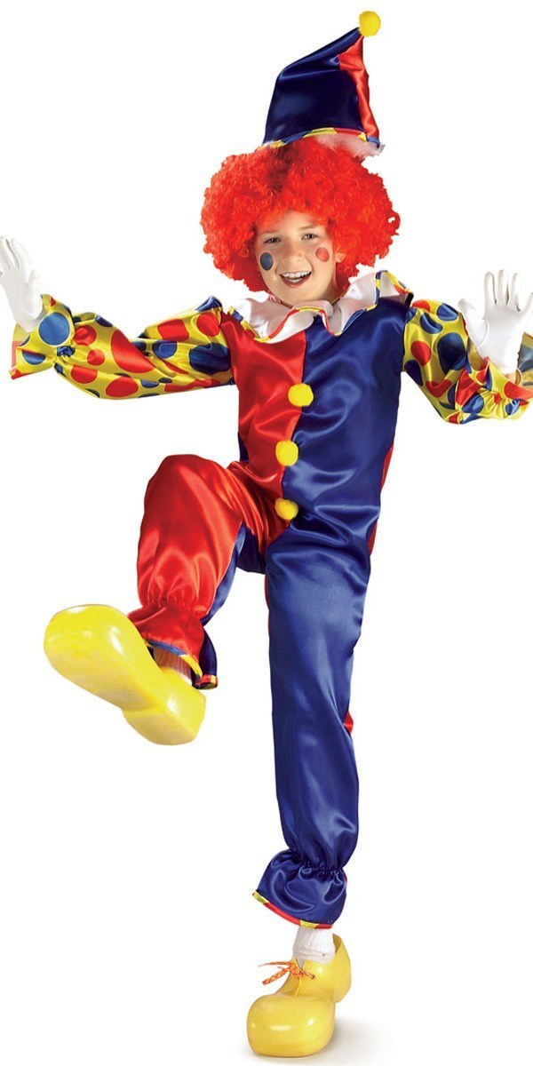 Tween Bubbles the clown costume is a bright blue and red jumpsuit with polka dot sleeves, over sized white collar and large green fur buttons, the costume also includes a matching clown hat.