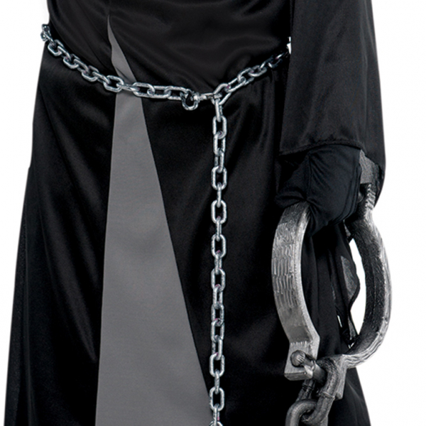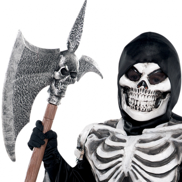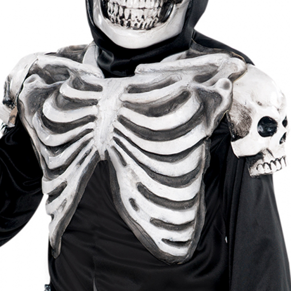 Our Crypt Keeper Costume features a hooded black robe with attached plastic ribcage and skull epaulettes, billowing sleeves and a jagged hem. The molded latex face mask is frozen in an eerie skeleton smile with mesh eyeholes for visibility.