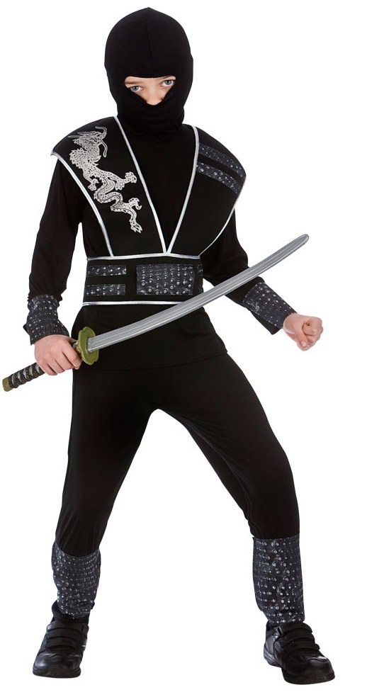 This Tween's Elite Shadow Ninja costume includes a black and silver top with attached armour and a pair of matching trousers. Also included is a ninja hood.