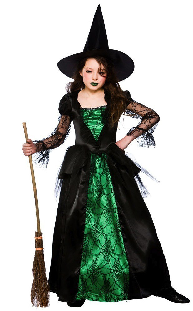 Emerald Witch costume consists of black and green dress with lace detailing and black witches hat.