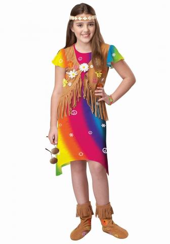 Teen Flower Hippy costume consists of a multicolour dress with peace sign print and a brown waistcoat style top with jagged ends and daisy print. The waistcoat features a daisy to keep the top closed.