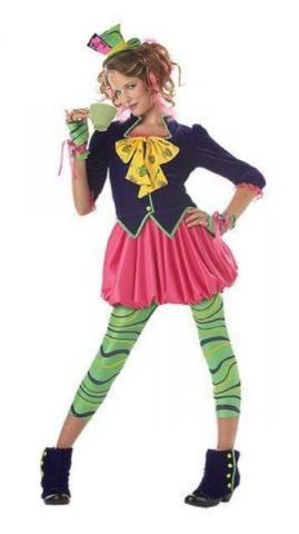 A favourite among our staff, this is a very cute and detailed costume. The Funky Mad Hatter Costume set includes a dress with purple velvet top and pink skirt with a bubble hem. The dress has an attached yellow neck bow with teapot pattern.