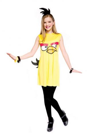 The costume features a yellow tank sleeveless dress with Angry Bird print. The dress also includes black Angry Bird tail.