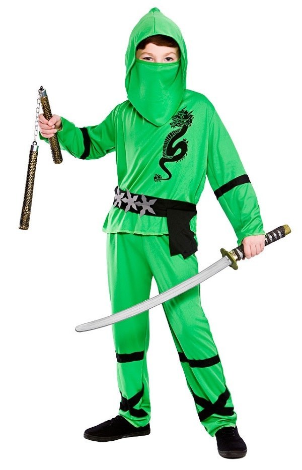 This Tween Power Ninja costume includes a green top with printed dragon and a hood. Also included is a pair green trousers with black leg straps and a black belt with ninja stars.