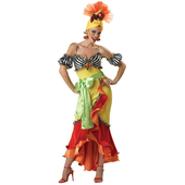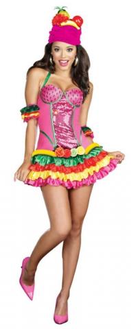 Juana Banana Costume is a sassy watermelon inspired dress with a pink sequin front accent and multi ruffled hemline sporting green, red, pink, and yellow layers. Be prepared for any weather with matching jacket with ruffled sleeves. This dress embodies comfort and fit with padded underwire cup with adjustable halter ties.