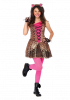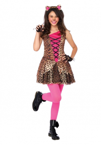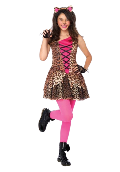 Jungle Kitty costume includes a lepord print mini dress with pink insert and black satin ties.