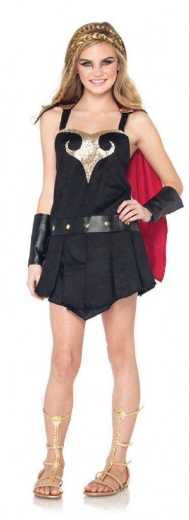 Teen Junior Warrior Princess Costume includes a dress with studded belt and a pair of arm cuffs. Also included in the warrior costume is a red cape.