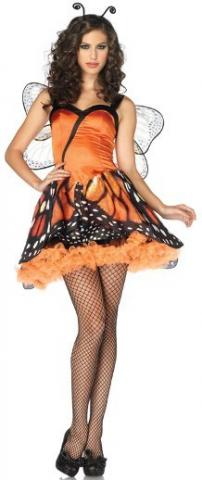 Teen Lovely Monarch costume includes an orange and black butterfly patterned dress and a black antennae headband.