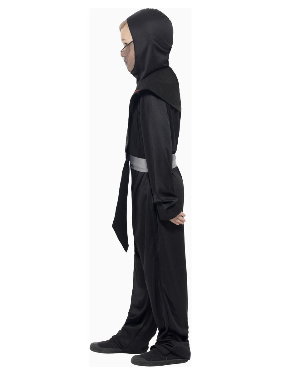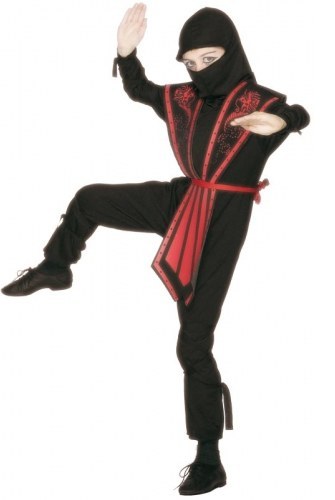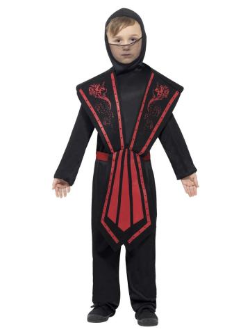 Kids Ninja Costume includes a black jumpsuit with attached black hood and red dragon detailing. To complete the costume a belt and bands are also included.