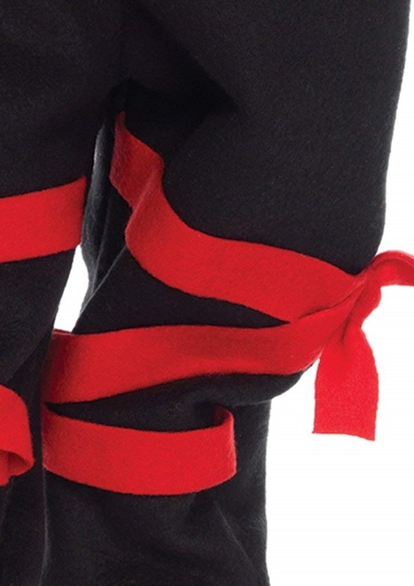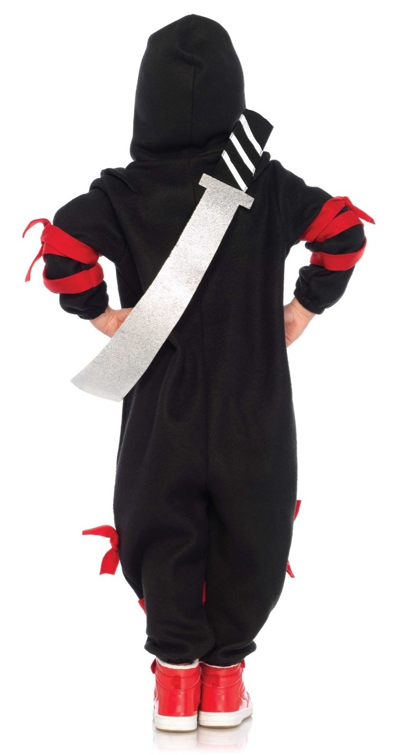 Tween Ninja Kigarumi Funsie costume includes a black hooded onesie with red straps and a foam sword.
