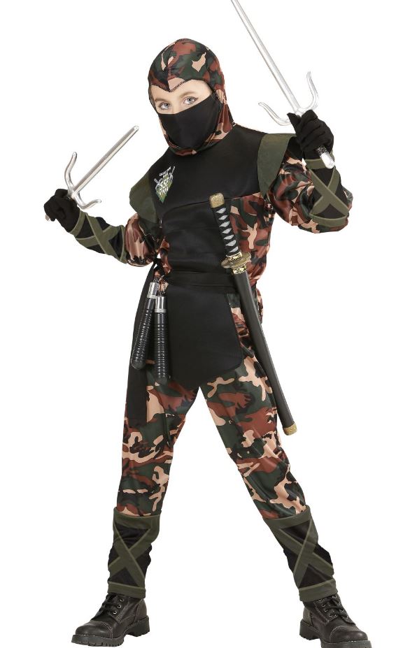 Included in this costume is a hooded coat, camo pants, belt and camo mask.