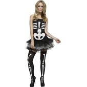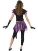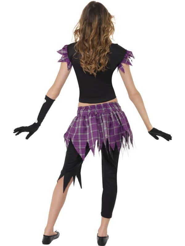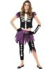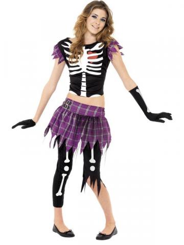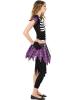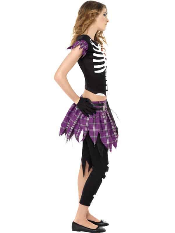 The Punky Bones Costume comes with a black top with skeleton rib cage at front and short purple sleeves with jagged ends and a short purple chequered skirt with jagged ends.