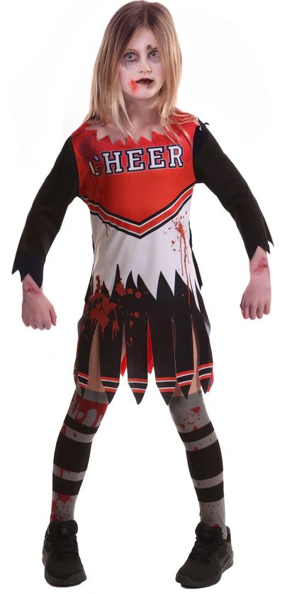 This costume includes a tattered cheer top, matching skirt, and zombie-inspired details to create an eerie yet fun appearance for Halloween and costume parties.