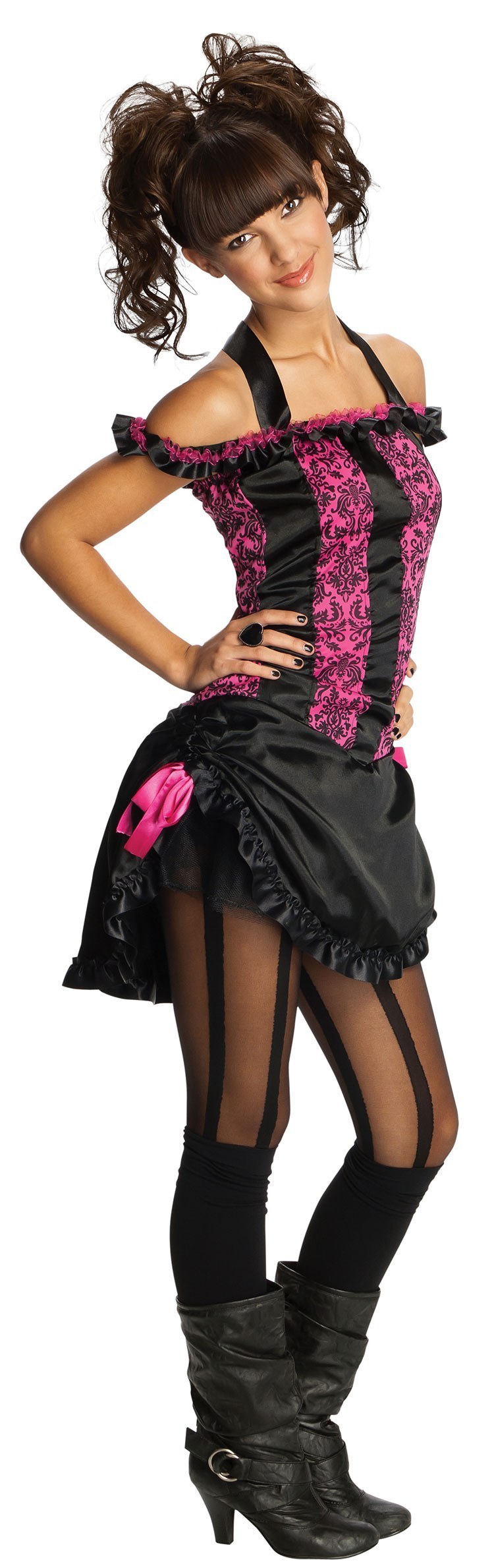 Our sassy Teen Saloon Girl costume consists of a pink and black dress with an off the shoulder top and halter neck strap. The skirt is black and can be scrunched up at the side with a pink ribbon.