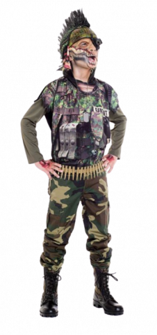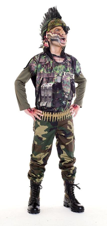 The Sergeant Splatter Costume - Teen Costume includes a hooded camouflage shirt with graphics and a frightening half mask.