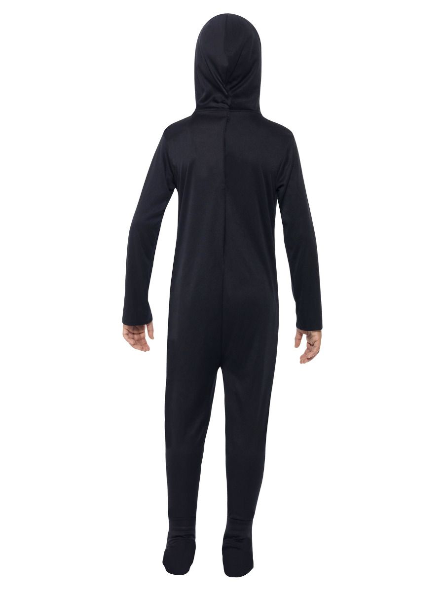 This Tween Skeleton Costume includes a one piece printed jumpsuit with attached hood.