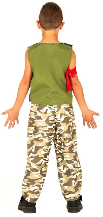 Lead the troops into war with our Tween Mercenary Costume. This soldier costume includes a zip up front waistcoat with a detachable neck scarf and band. Costume also includes a pair of camouflage trousers and a red armband.