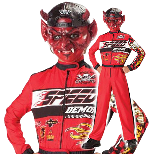 This costume includes a jumpsuit with racing graphics and vinyl mask.