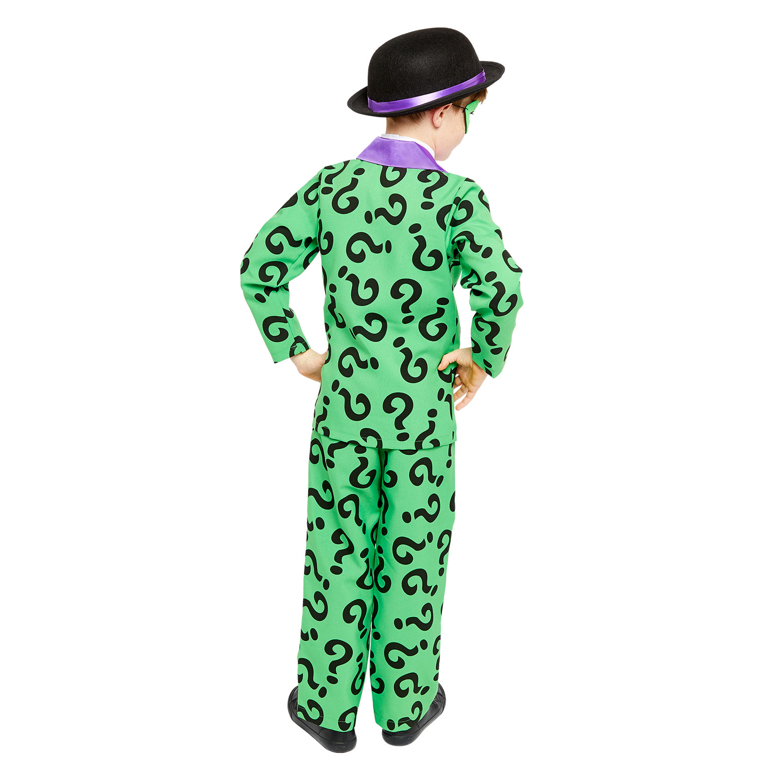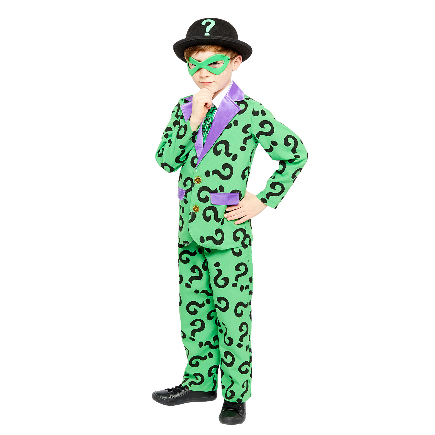 This Tweens The Riddler Costume includes a jacket and trousers with a mock shirt and tie. To complete the look a molded hate and eye mask are also included.