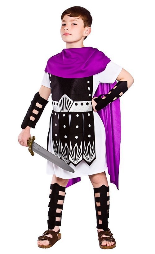 Tween Roman Warrior costume includes a one piece tunic with printed armour and a purple cape. Also included is a pair of leg and arm guards.
