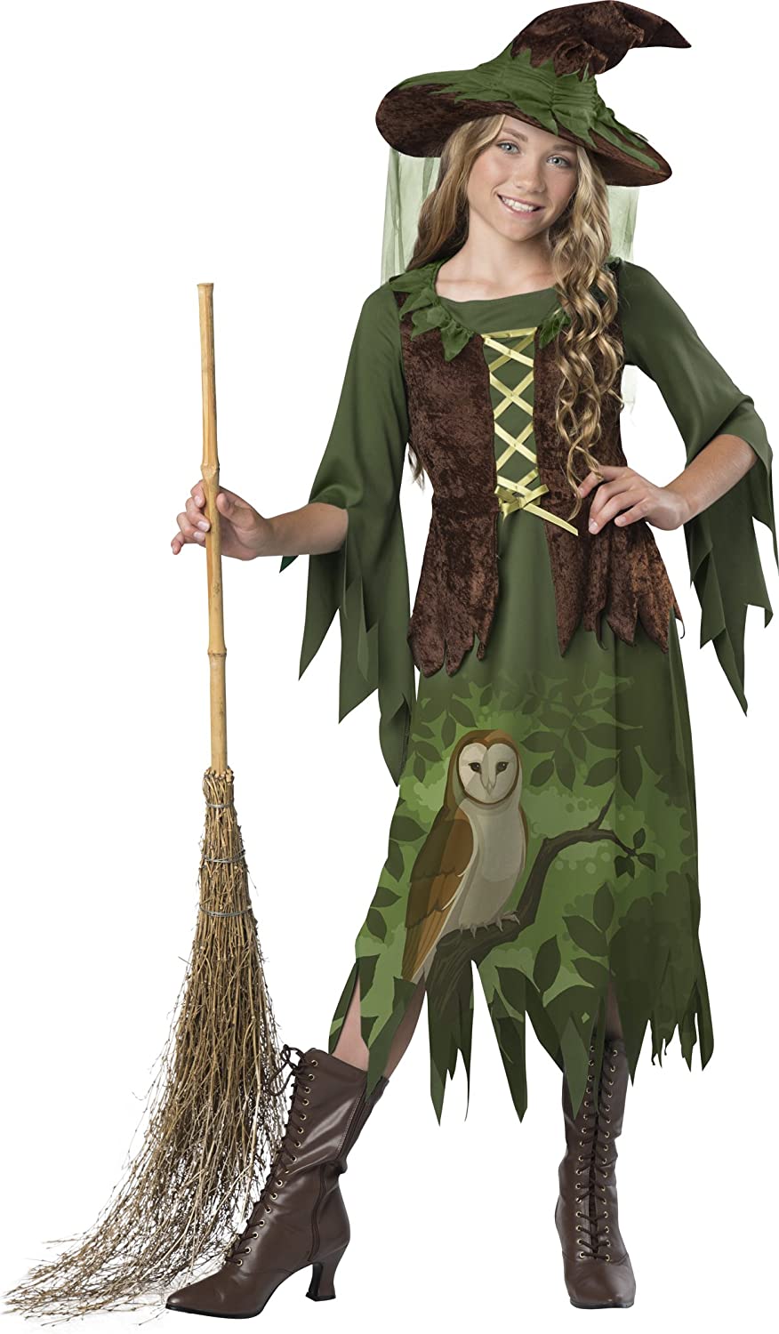 Included is a forest themed printed dress with faux vest and a hat with tattered veil.
