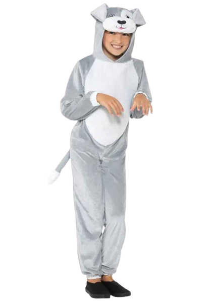 This costume includes a grey hooded jumpsuit featuring dog face and ears.