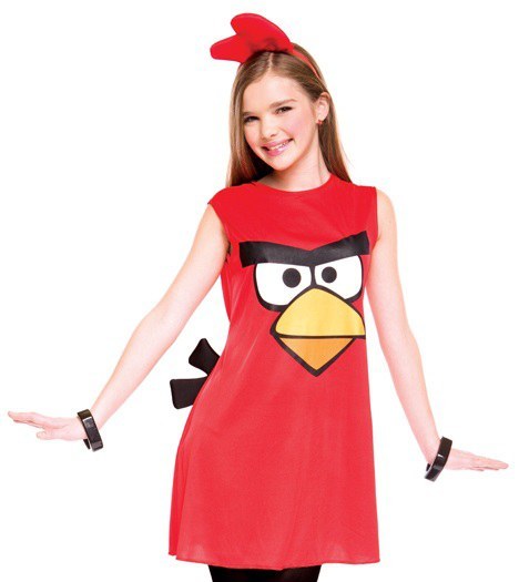 The costume features a red Angry Bird print sleeveless dress with black tail. The look is completed with a black Angry Bird headband.