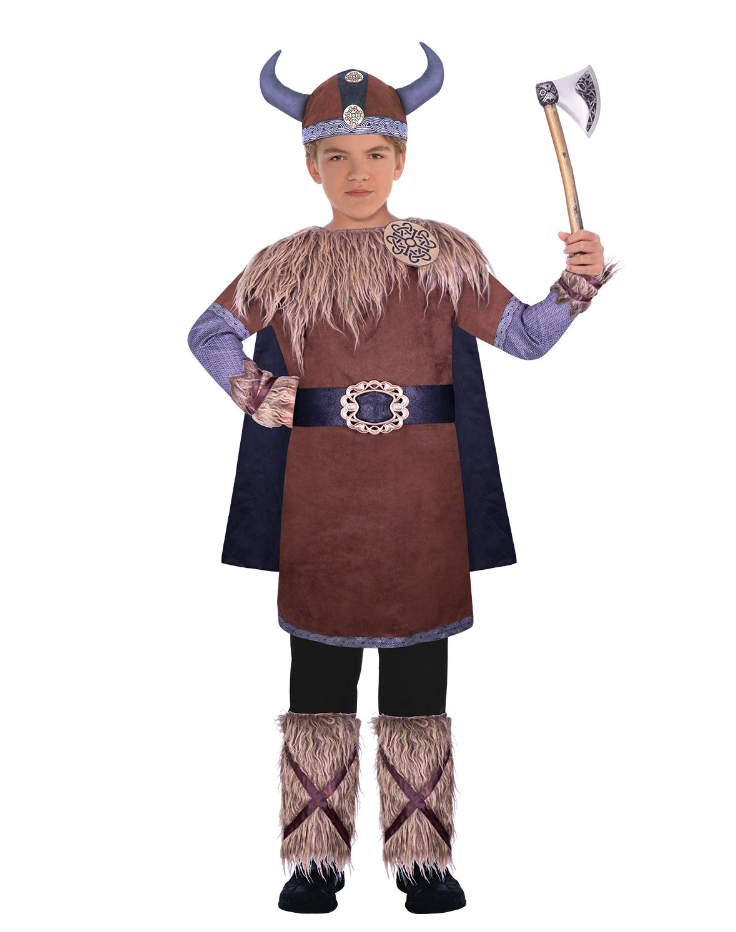 This Tween Wild Viking Warrior costume features a brown tunic with faux fur details, belt and cape. To complete the look a a set of fur leg warmers and soft hat with horns are also included.