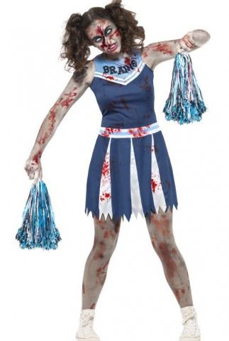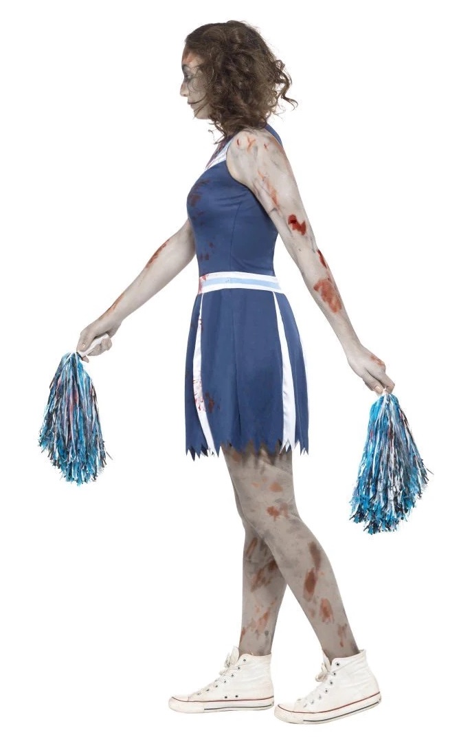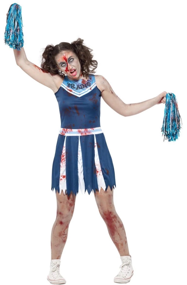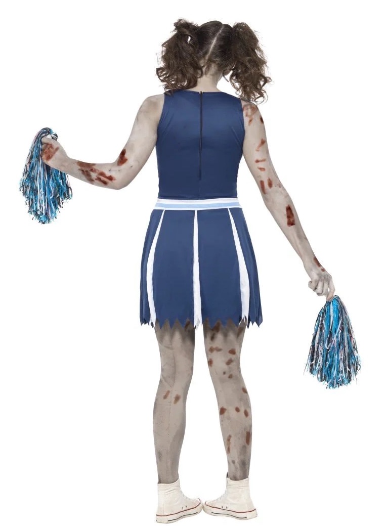 Teen Zombie Cheerleader costume includes a blue and white dress with splattered blood and a pair of pom poms.