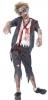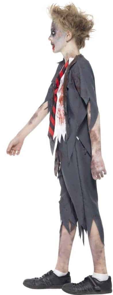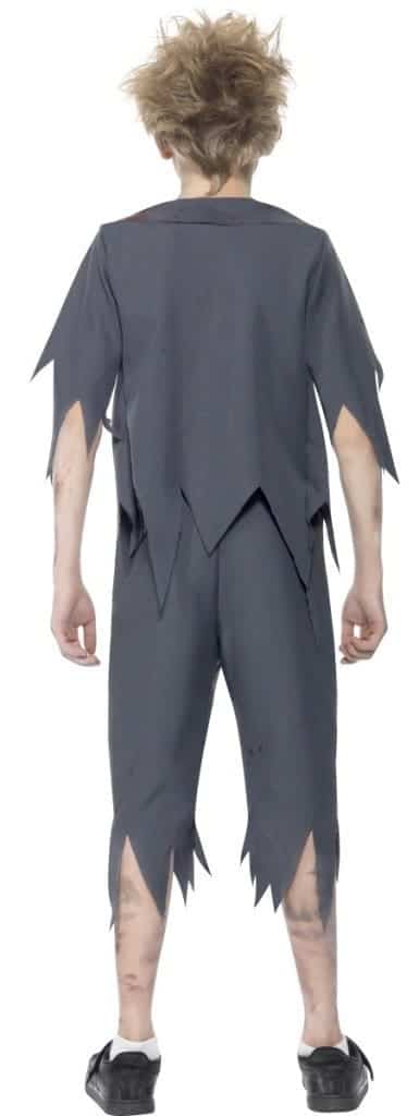 Teen Zombie School Boy costume includes a grey ripped jacket with blood stains and an attached mock shirt and tie. Also included in this gruesome look is a pair of ripped three quarter length trousers.