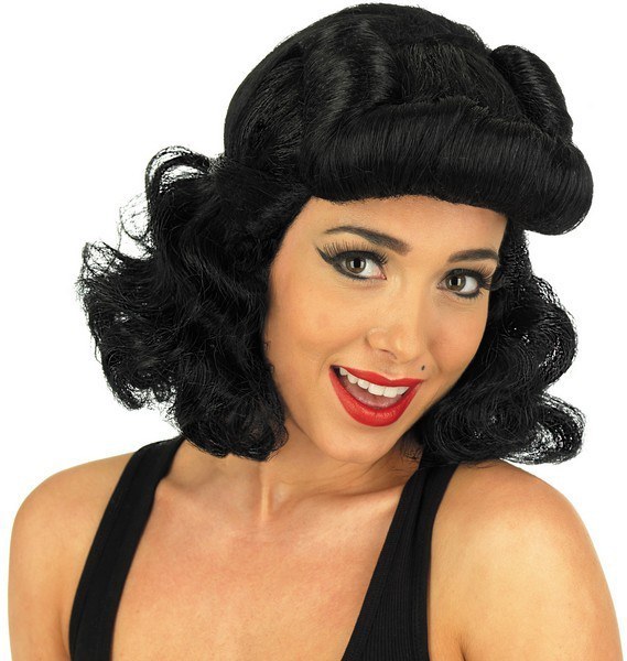 Be that stunning 1940's pin up girl with this magnificent black 40's pin up wig with its jet black colour, quifed fringe and beautiful loose curls.