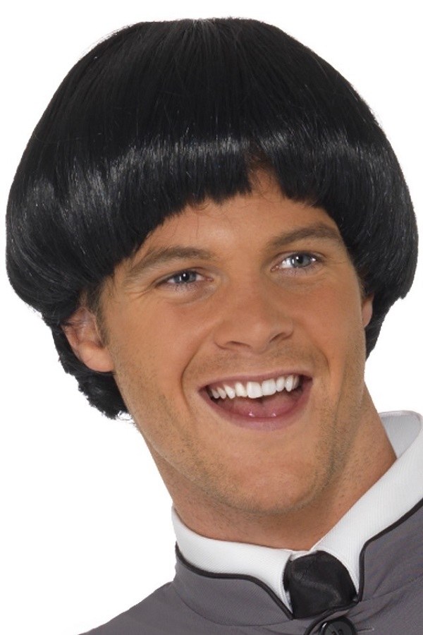 Short Black Swinging 60's Bowl Wig. The wig also features an attached wig cape to hold the wig securely onto your head and to stop any stray hairs that might give away the look.