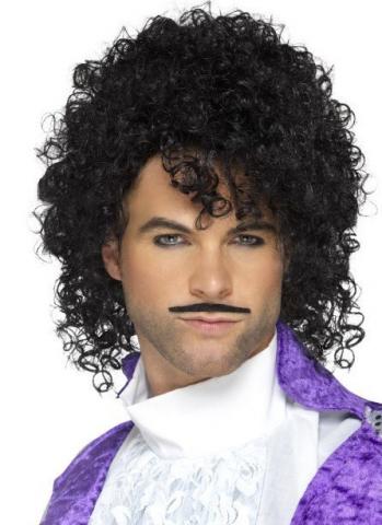 80's Purple Musician Kit includes a black curly wig with an attached wig cap and a black moustache.