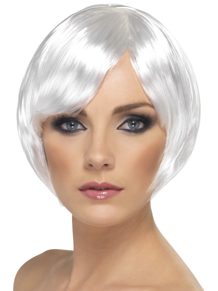 White, short bob Babe wig with fringe.