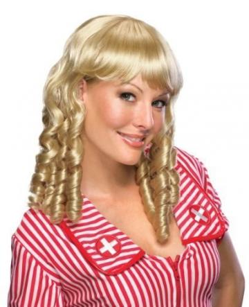 Deluxe natural looking wig with shades of brown and blonde, ringlets and attached lace wig cap.